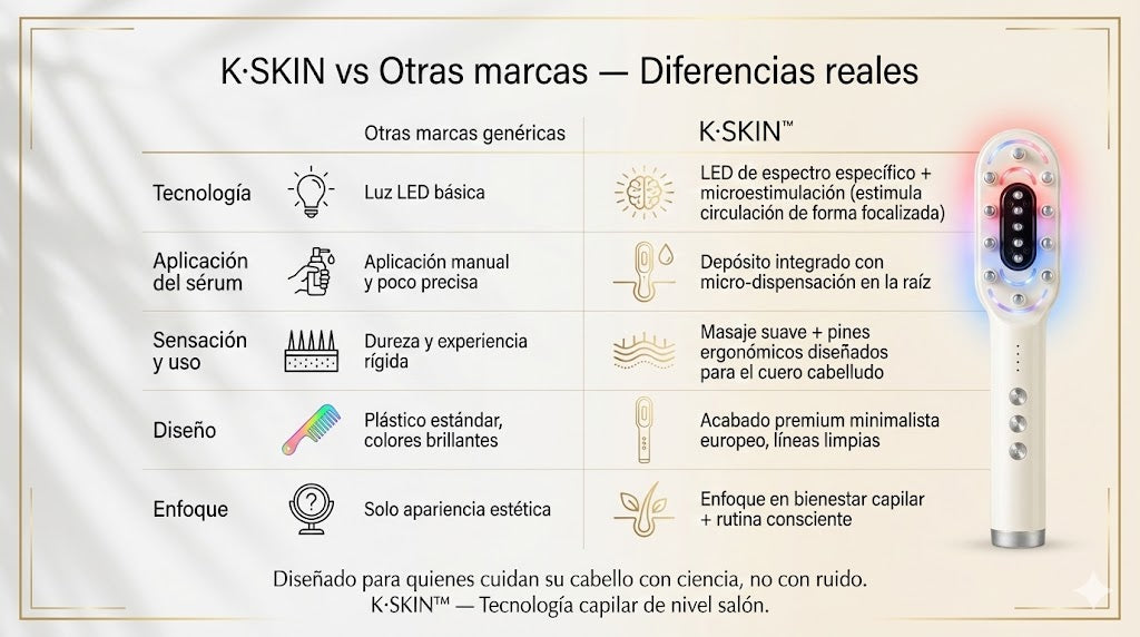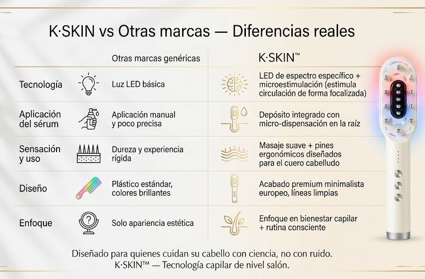 El G3 HairPro de K·SKIN es un peine de terapia capilar diseñado para fortalecer la raíz, mejorar la circulación y reducir la caída del cabello. Utiliza tecnología LED de uso profesional combinada con microestimulación para reactivar el cuero cabelludo y mejorar la densidad desde la raíz.